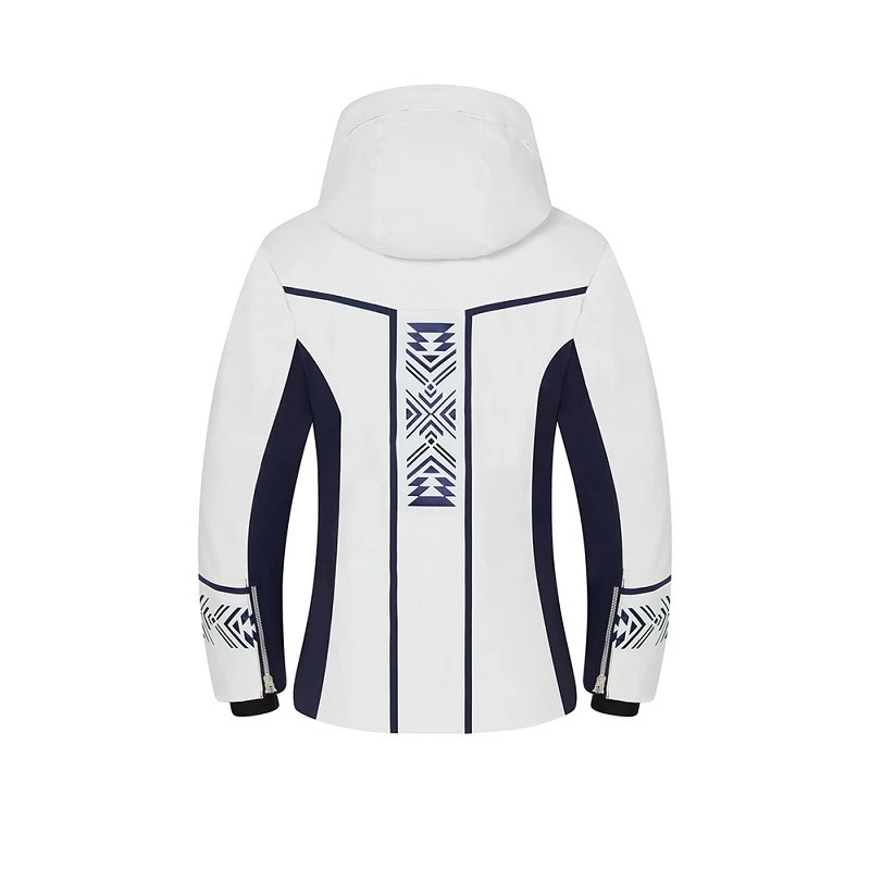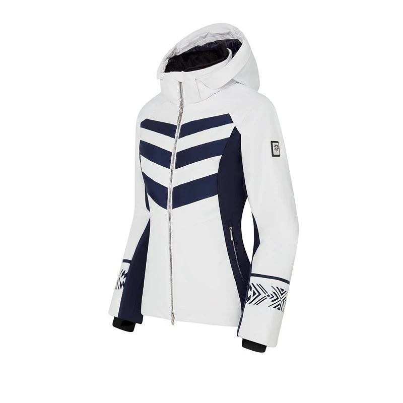 Een elegant, sportief jack met een krachtig primitief motief op de mouwen en middenachter. Inzetstrepen van satijnstof worden met een laser uitgesneden en met een nieuw lijmproces bevestigd. De elegantie wordt versterkt door het afwisselende glanzende en matte effect, met hybride donsisolatie die het een driedimensionaal gevoel geeft. De sluiting van zilverfolie in twee richtingen voegt ook een gevoel van kracht toe, maar is eigenlijk licht en gemakkelijk te gebruiken. De verwijderbare boa’s van bont voor de capuchon gaan door voor dit seizoen en worden apart verkocht.